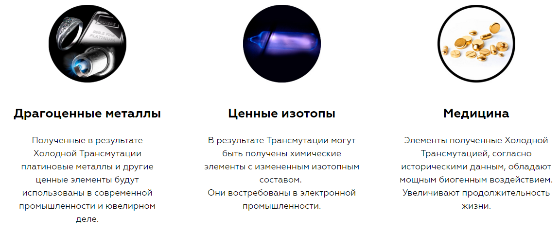 Мы уже добились успешных результатов экспериментов. В результате Холодной Трансмутации получены платиновые металлы, а также различные химических элементы. Но это еще пока эксперименты, в результате которых мы получаем лишь граммы новых химических элементов. Теперь наша задача перевести Холодную Трансмутацию химических элементов с экспериментального на промышленный уровень. Для этого нам нужны необходимое оборудование, приборы и дополнительный персонал. Полученные в результате Холодной Трансмутации химические элементы найдут применение в промышленности, медицине, науке, финансах.